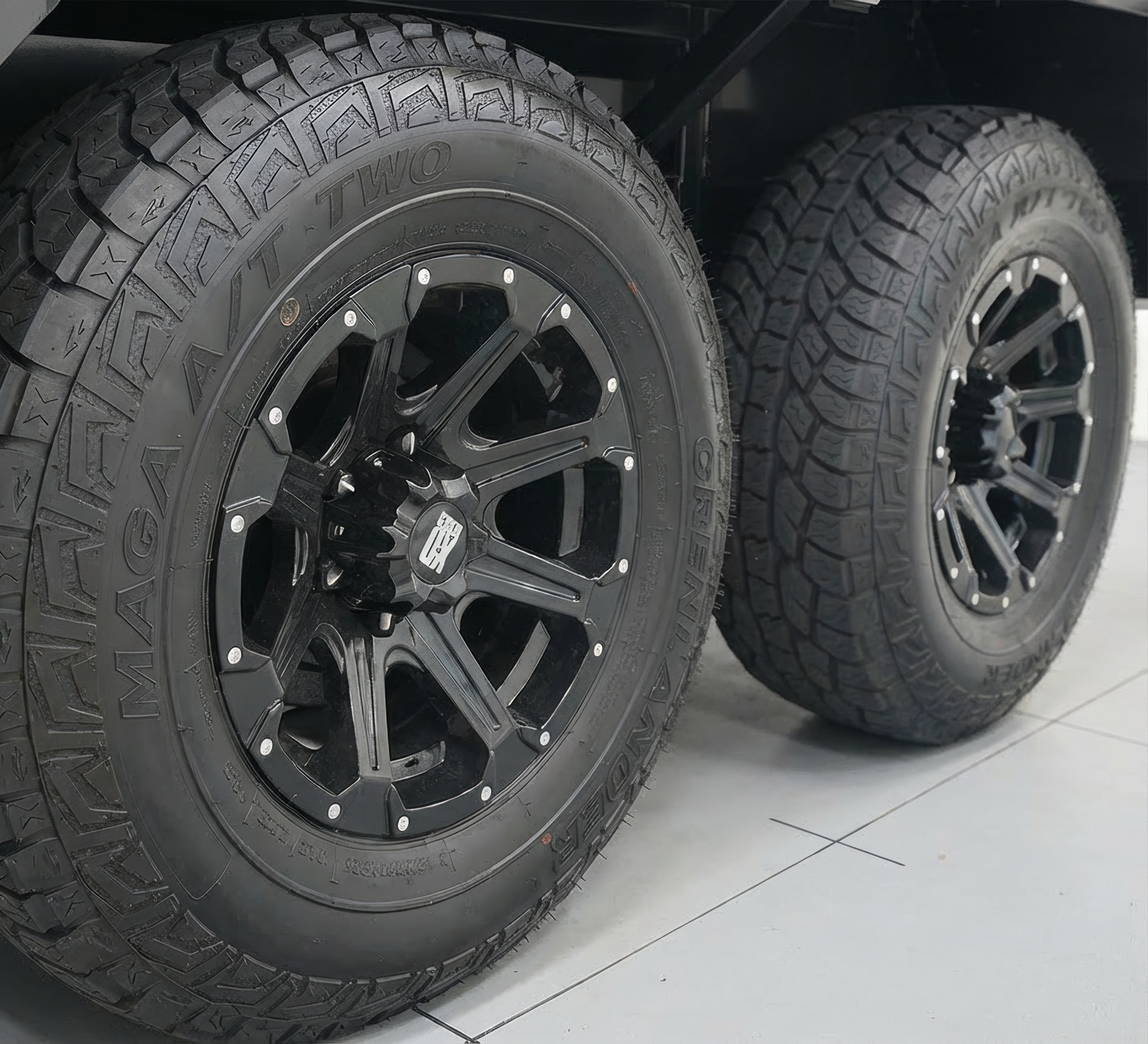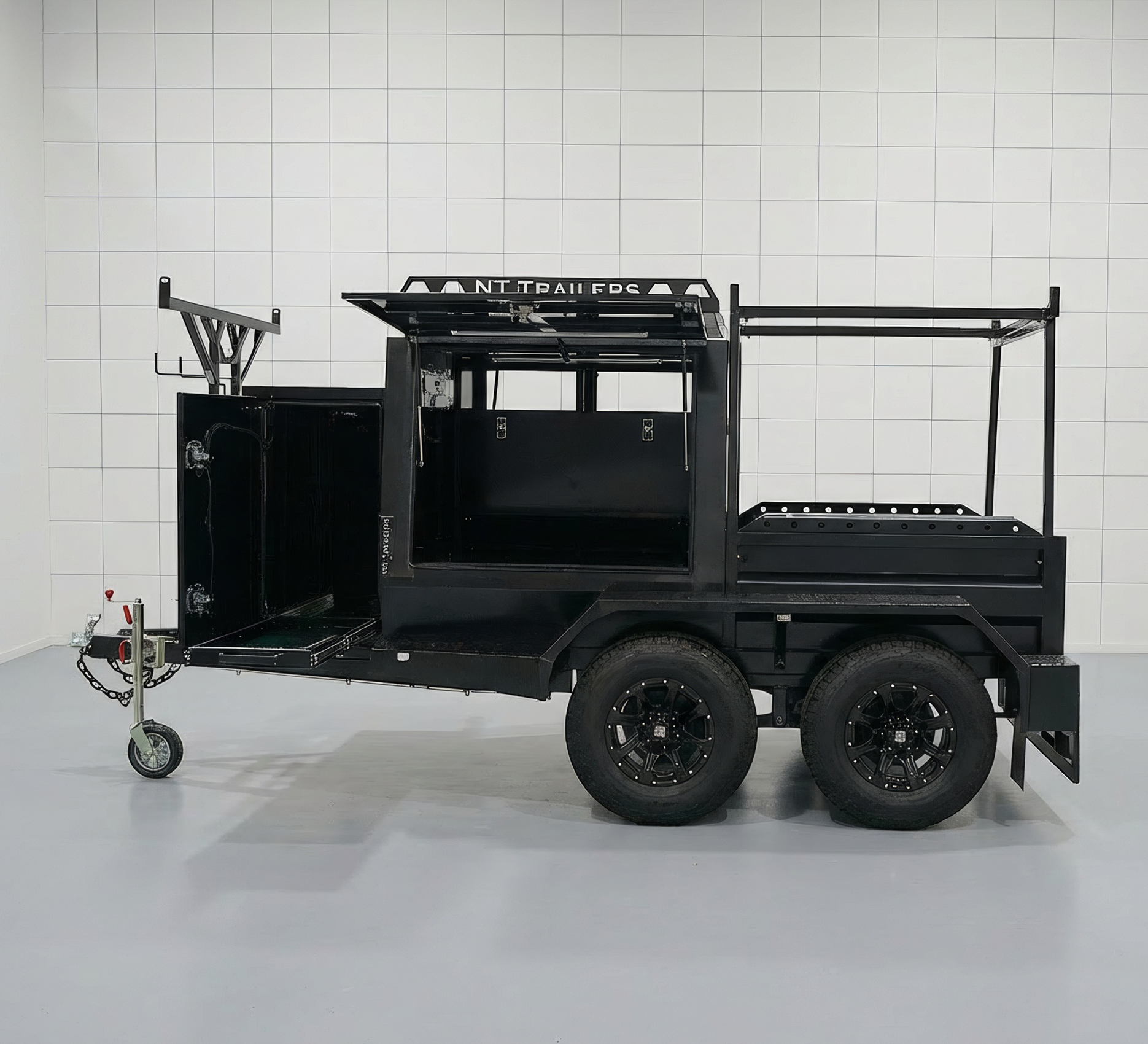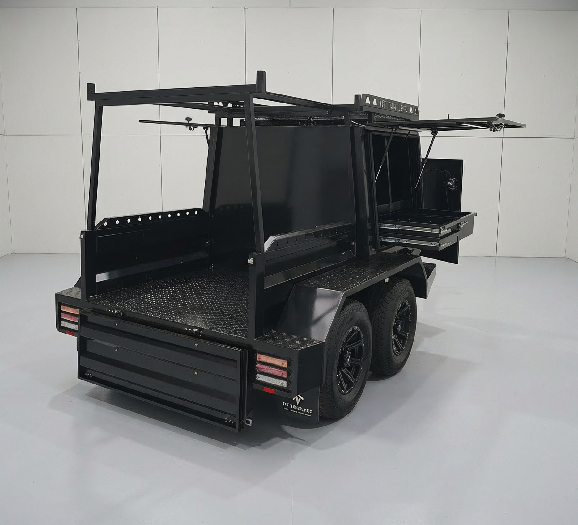 Professional dual-axle combo trailers with galvanized steel construction and advanced electrical systems for maximum versatility. Features extensive storage compartments, heavy-duty fridge slides, and off-grid power capabilities for multi-trade applications.