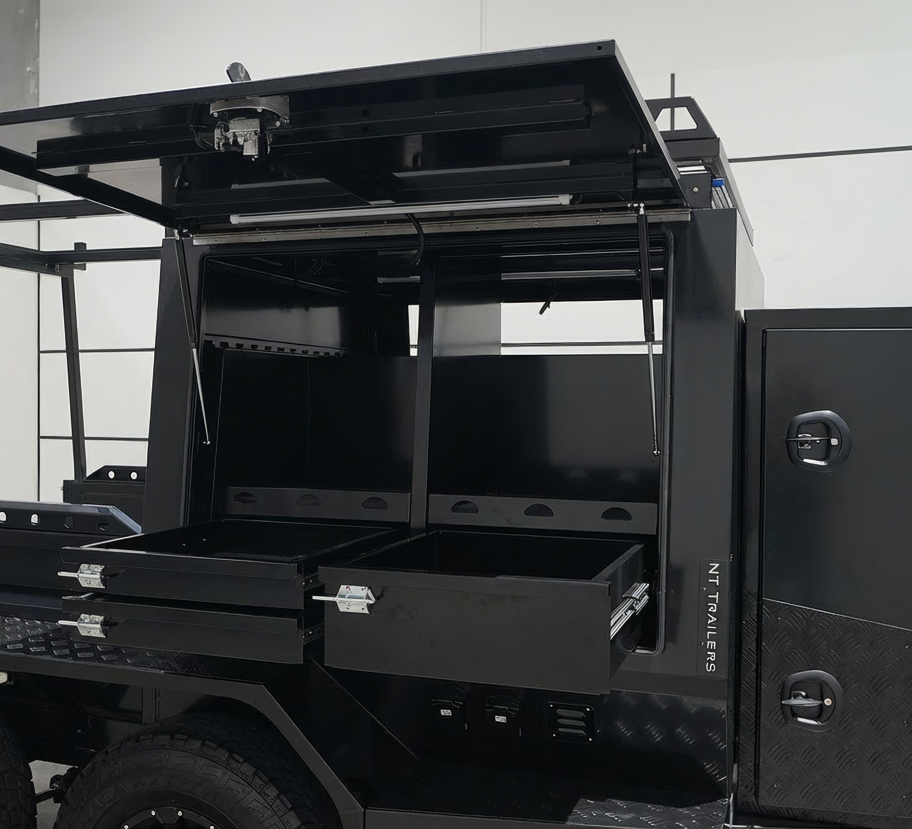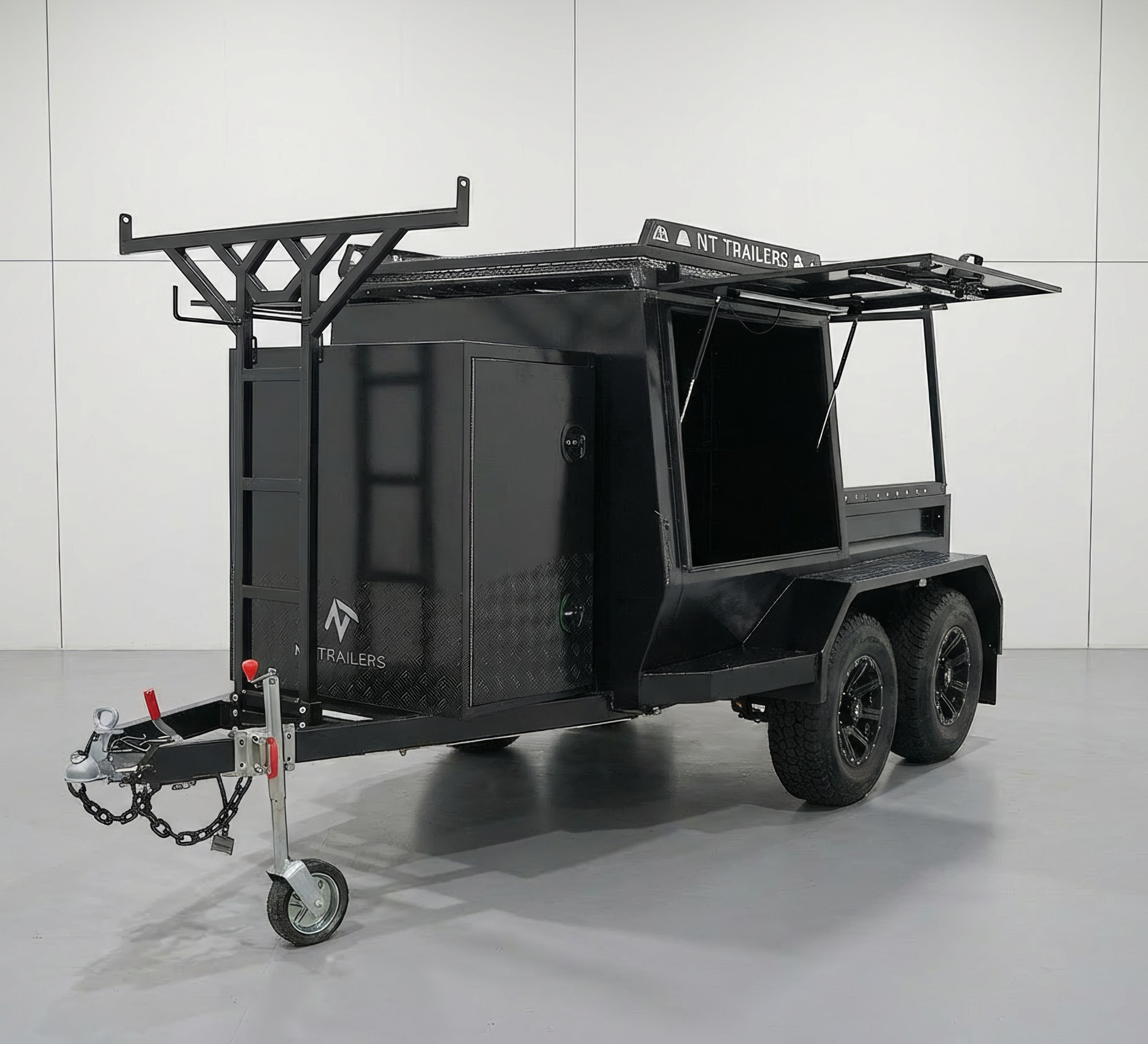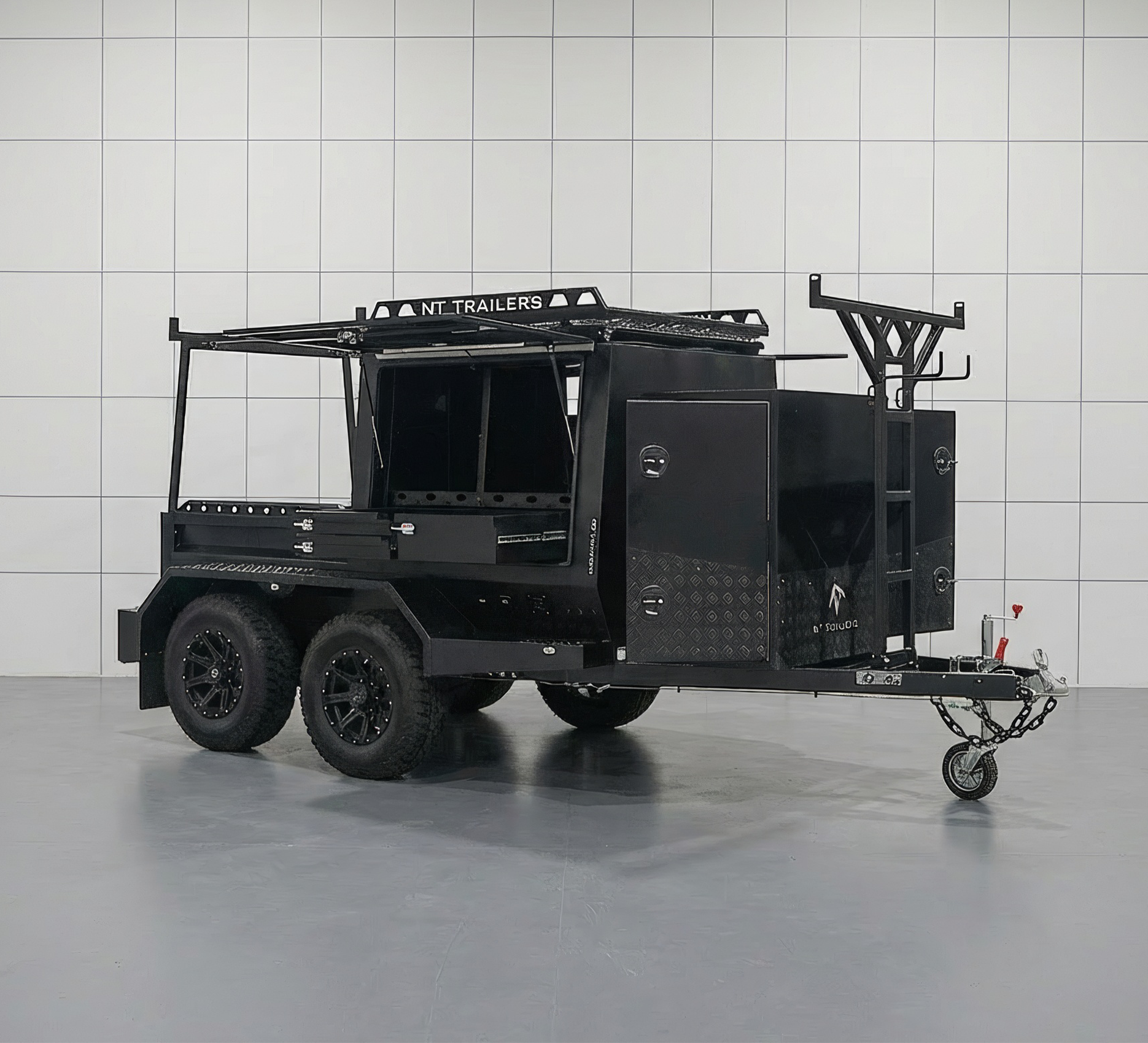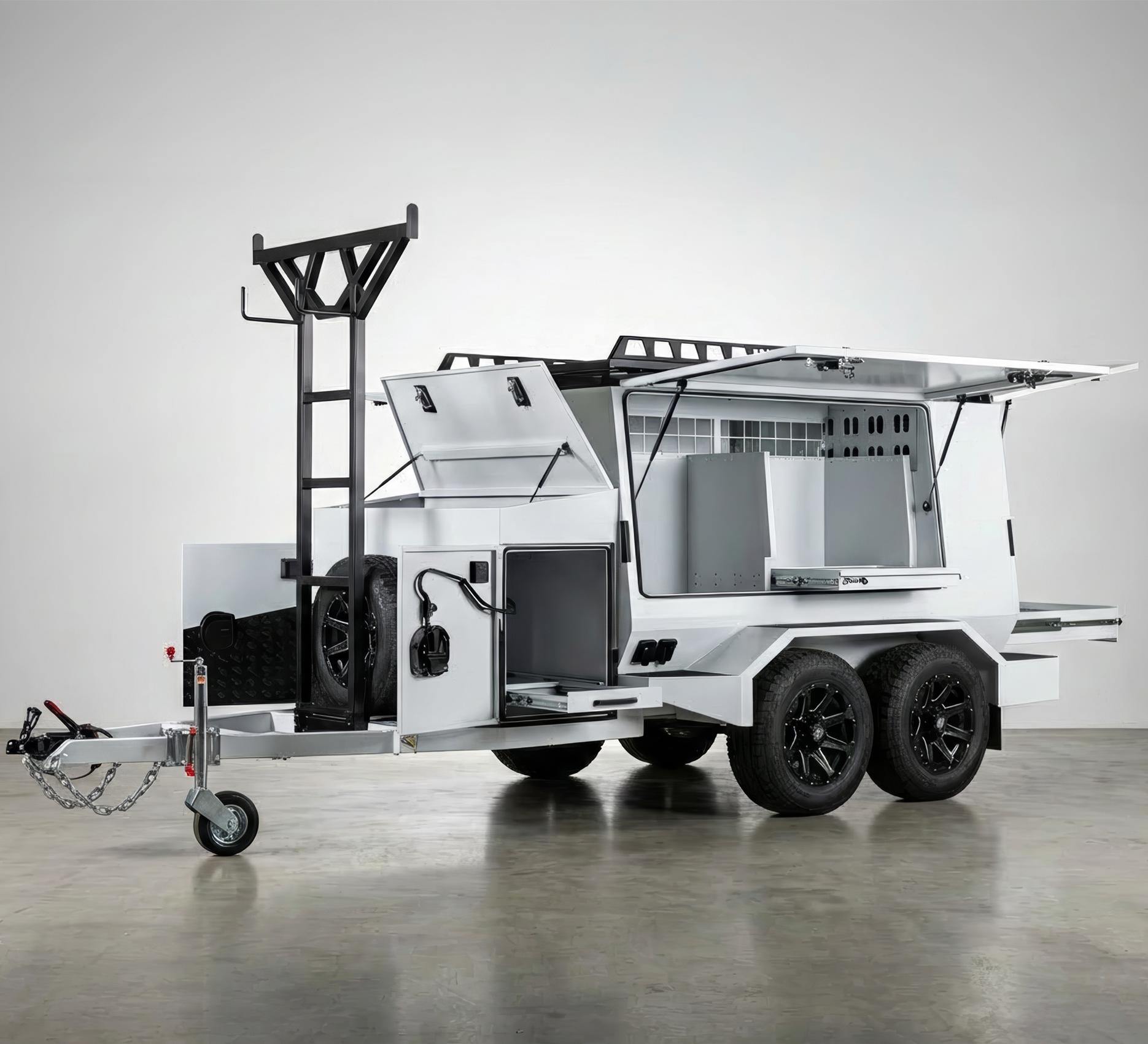 Professional dual-axle combo trailers with galvanized steel construction and advanced electrical systems for maximum versatility. Features extensive storage compartments, heavy-duty fridge slides, and off-grid power capabilities for multi-trade applications.